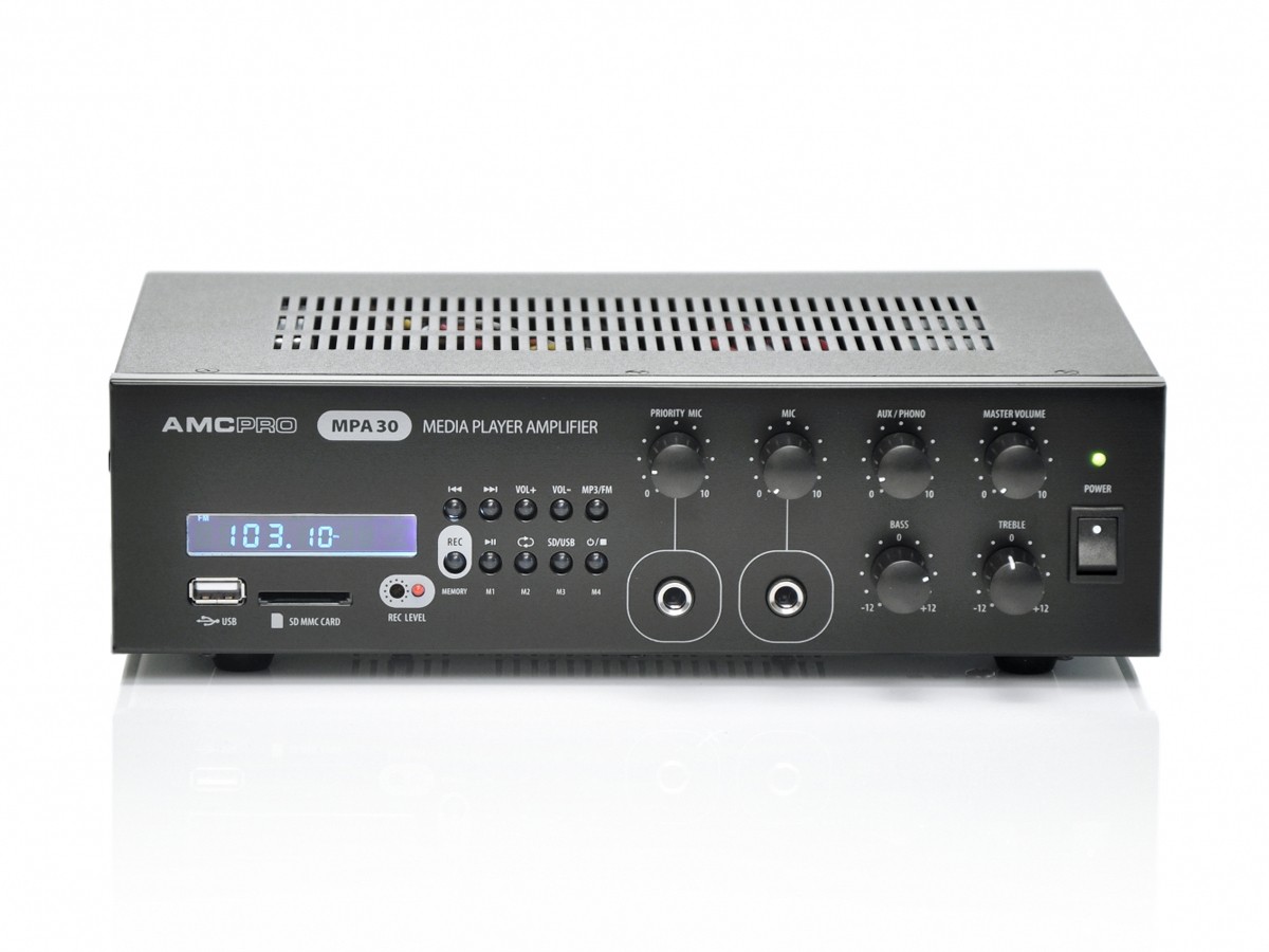 MPA 30 to multimedialny wzmacniacz o szerokich możliwościach. Posiada 3 wejścia na źródło sygnału audio (1 LINE + 2 MIC) oraz odtwarzacz plików z pamięci USB, kart SD i MMC. Wzmacniacz ten umożliwia miksowanie sygnałów audio, regulację głośność oraz equalizację. Ponadto MPA 30 może pracować zarówno w trybie niskoimpedancyjnym (4Ω) jak i wysokoimpedancyjnym (25V, 70V czy 100V). Wszystko to zostało zamknięte w niewielkim urządzeniu z bardzo intuicją obsługą.