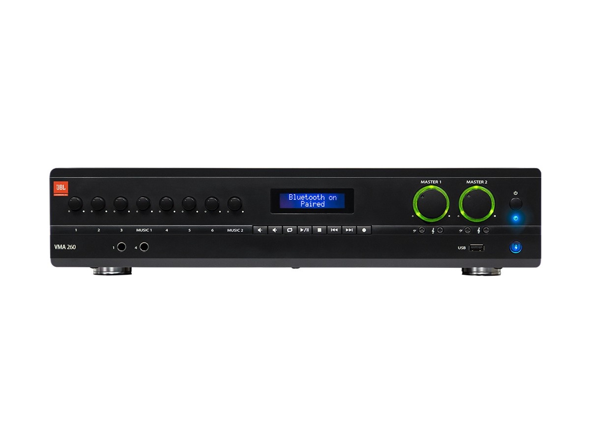 VMA 260 to Mikser-wzmacniacz i odtwarzacz USB/Bluetooth 2x60W/70V/100V/4 Ohm/8 Ohm, bez wentylatora, wysokość 2U wysokości, 8 wejść, 2 wyjścia, niezależna kontrola bass/treble, sygnalizacja dźwiękowa komunikatów, mutowanie priorytetowe, kompatybilne ze sterownikami ściennymi JBL Commercial, zbalansowane wejścia mic/line, RCA, uchwyty rack w komplecie
