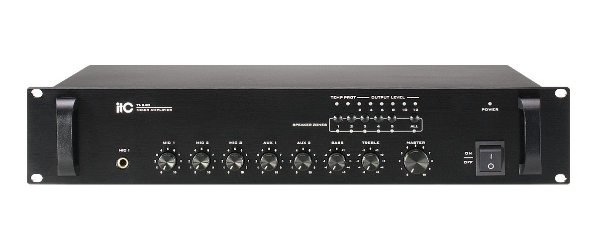 Wzmacniacz miksujący TI-240 marki ITC Audio to najwyższa jakość produktów dedykowanych dla systemów radiowęzłowych Public Address 100V. Wyposażony jest w 3 wejścia mikrofonowe MIC, 2 wejścia liniowe AUX oraz wejście alarmowe EMC, który wraz z MIC1 posiadają priorytet nad pozostałymi wejściami. Wejścia MIC i AUX mają osobną regulację barwy dźwięku w postaci dwóch gałek regulacji – osobno dla basu i sopranu.