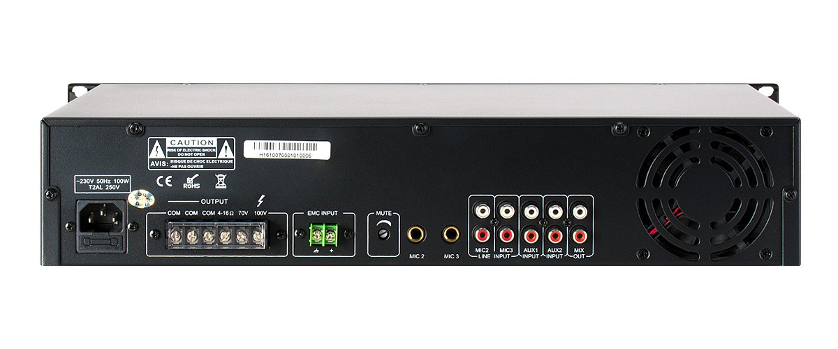 Mamy możliwość załączenia osobno każdego z pięciu sygnałów, które są niezależne względem siebie. Następuję to poprzez przyciski umiejscowione na płycie frontowej. Urządzenie posiada także wyjście główne końcówki mocy w wersji niskoimpedancyjnej oraz napięciowej. Wzmacniacza posiada wyjścia linii głośnikowych 70V, 100V oraz 4-16 Ohm, funkcje przełączania źródła ( LINE, TUNER, CD, TAPE) jednym przyciskiem, kompaktową obudowę RACK 19”/2U umożliwiającą montaż do powierzchni instalacyjnej w pozycji pionowej lub poziomej, jak również w zabezpieczenia zwarciowe i temperaturowe, sygnalizację załączenia i zabezpieczeń oraz 6 punktowy wskaźnik poziomu wysterowania (LED)