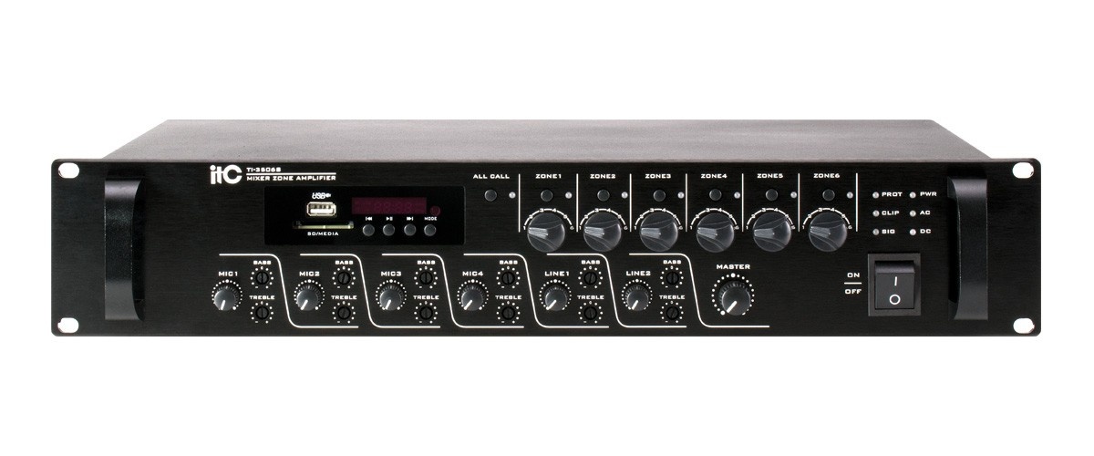 6-cio strefowa centrala nagłośnienia TI-5006S marki ITC Audio przeznaczona jest dla systemów radiowęzłowych Public Address 100V, dostarczając muzykę tła, komunikaty słowne i alarmowe w małych i średnich obiektach. Doskonale sprawdzi się w sklepach, poczekalniach, czy szkołach.