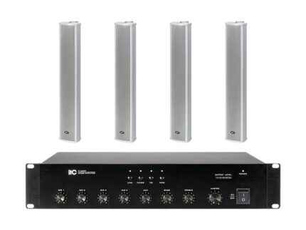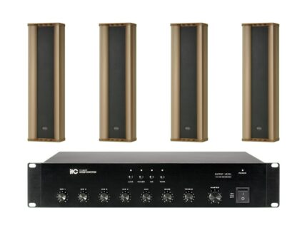 Zestaw przeznaczony jest do nagłośnienia powierzchni nie przekraczającej 60 m². W skład zestawu wchodzą: 4 kolumny naścienne ITC T-704A oraz wzmacniacz ITC T-120FP.