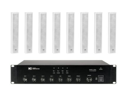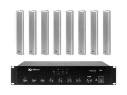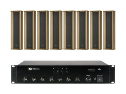 Zestaw przeznaczony jest do nagłośnienia powierzchni nie przekraczającej 150 m². W skład zestawu wchodzi: 8 kolumn naściennych ITC T-704A oraz wzmacniacz ITC T-240FP.