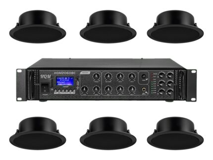Zestaw przeznaczony jest do nagłośnienia powierzchni nie przekraczającej 100 m². W skład zestawu wchodzi: 6 głośników sufitowych MONACOR EDL-11TW/SW, oraz wzmacniacz HQM 2060BC.