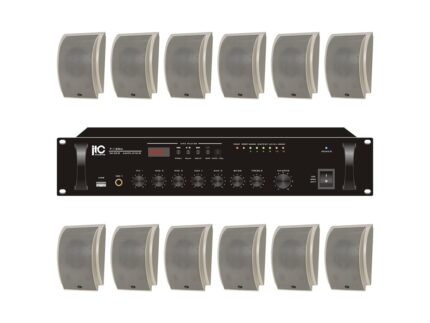 Zestaw przeznaczony jest do nagłośnienia powierzchni nie przekraczającej 200 m². W skład zestawu wchodzi: 12 głośników naściennych ITC T-612 oraz wzmacniacz jednostrefowy ITC T-120.