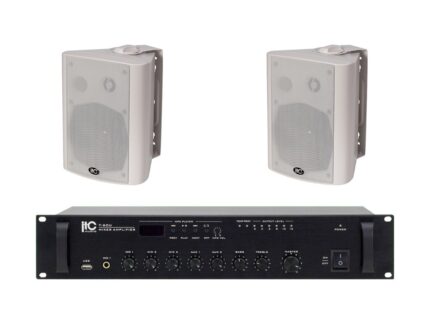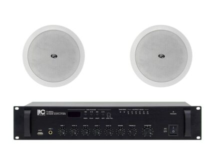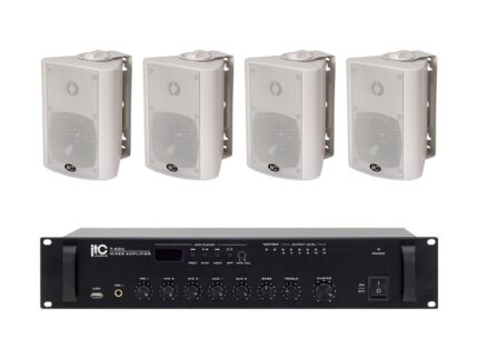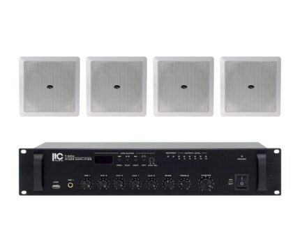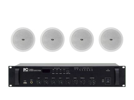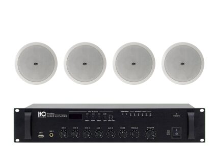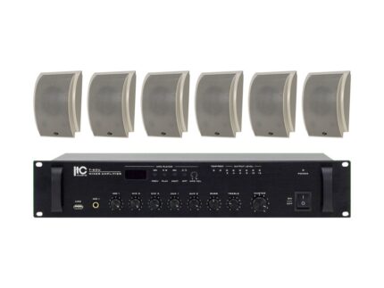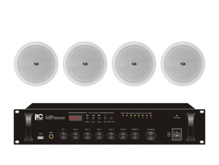 Zestaw przeznaczony jest do nagłośnienia powierzchni nie przekraczającej 60 m². W skład zestawu wchodzą: 4 głośniki sufitowe ITC T-206P oraz wzmacniacz jednostrefowy ITC T-120.