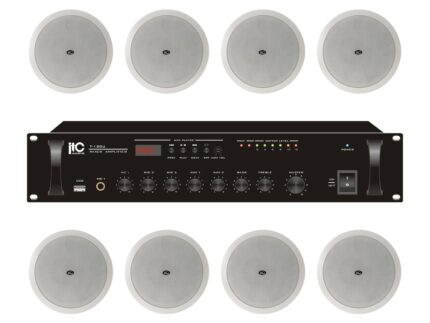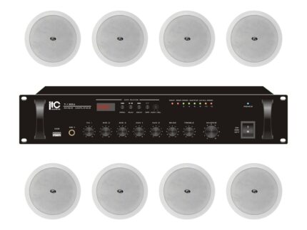 Zestaw przeznaczony jest do nagłośnienia powierzchni nie przekraczającej 150 m². W skład zestawu wchodzi: 8 głośników sufitowych ITC T-208A oraz wzmacniacz jednostrefowy ITC T-120.