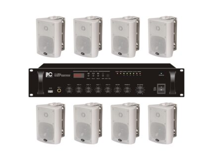 Zestaw przeznaczony jest do nagłośnienia powierzchni nie przekraczającej 150 m². W skład zestawu wchodzI: 8 głośników naściennych ITC T-774 oraz wzmacniacz jednostrefowy ITC T-120