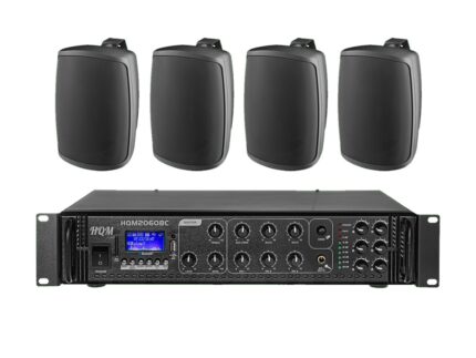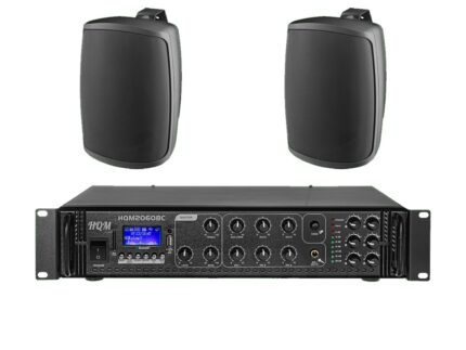 Zestaw przeznaczony jest do nagłośnienia powierzchni nie przekraczającej 60 m². W skład zestawu wchodzą: 4 głośniki naścienne MONACOR EUL-60, oraz wzmacniacz HQM 2060BC