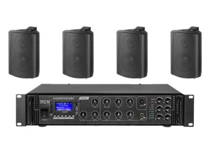 Zestaw przeznaczony jest do nagłośnienia powierzchni nie przekraczającej 60 m². W skład zestawu wchodzą: 4 głośniki naścienne MONACOR WALL-06T, oraz wzmacniacz HQM 2060BC