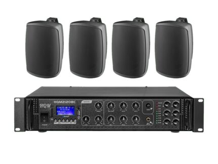 Zestaw przeznaczony jest do nagłośnienia powierzchni nie przekraczającej 60 m². W skład zestawu wchodzą: 4 głośniki naścienne MONACOR WALL-06T, oraz wzmacniacz HQM 2120BC