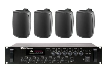 Zestaw przeznaczony jest do nagłośnienia powierzchni nie przekraczającej 60 m². W skład zestawu wchodzą: 4 głośniki naścienne MONACOR WALL-06T, oraz wzmacniacz ITC TI-1206S