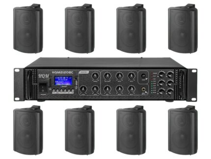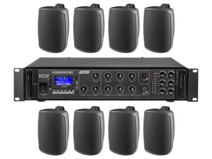 Zestaw przeznaczony jest do nagłośnienia powierzchni nie przekraczającej 150 m². W skład zestawu wchodzi: 8 głośników naściennych MONACOR WALL-04T, oraz wzmacniacz HQM 2120BC