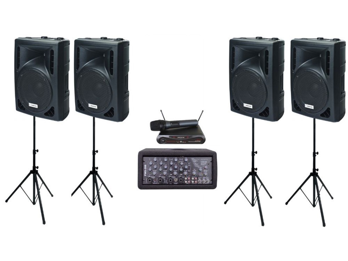 W skład zestawu wchodzą 4 kolumny pasywne ze stalowymi statywami, powermikser oraz mikrofon bezprzewodowy.