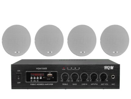 Zestaw przeznaczony jest do nagłośnienia powierzchni nie przekraczającej 60 m². W skład zestawu wchodzą: 4 dwudrożne głośniki sufitowe HQM SOZ10 oraz wzmacniacz HQM 1060E